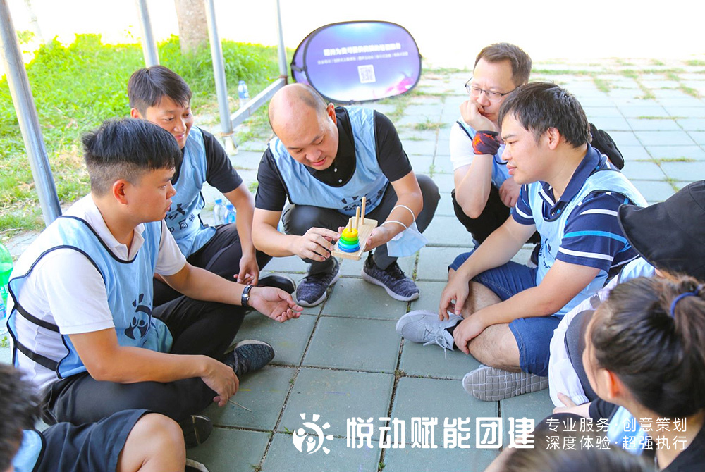 全隊人員合作將漢諾塔從初始位置A原樣移動到C(如圖),每次只允許一個人移動碟子,且每次僅允許移動一個碟子的位置;在團隊所有成員必須依次移動盤子;在任意一次移動中,較小的盤子不得被置于較大的盤子下方;正式開始以后,除移動盤子的隊員外,其他隊員必須站在培訓師規(guī)定的距離以外。
