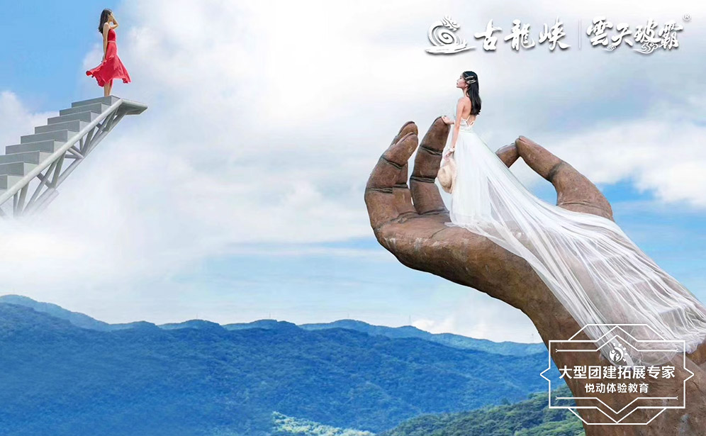 天空之梯和通天神掌 均建于古龍峽懸崖絕壁之上,云天玻霸旁邊,是一個姊妹項目,又像一個人的雙手。層層數階接天去,步步登高入云來。鋼結構的梯子設在玻璃橋頭,下設安全圍網,整個梯身以藍灰色為主,向天空延伸,緩緩走上階梯,仿佛要一步步走向天空之城,直至梯子頂部與湛藍的天空融為一體。 |