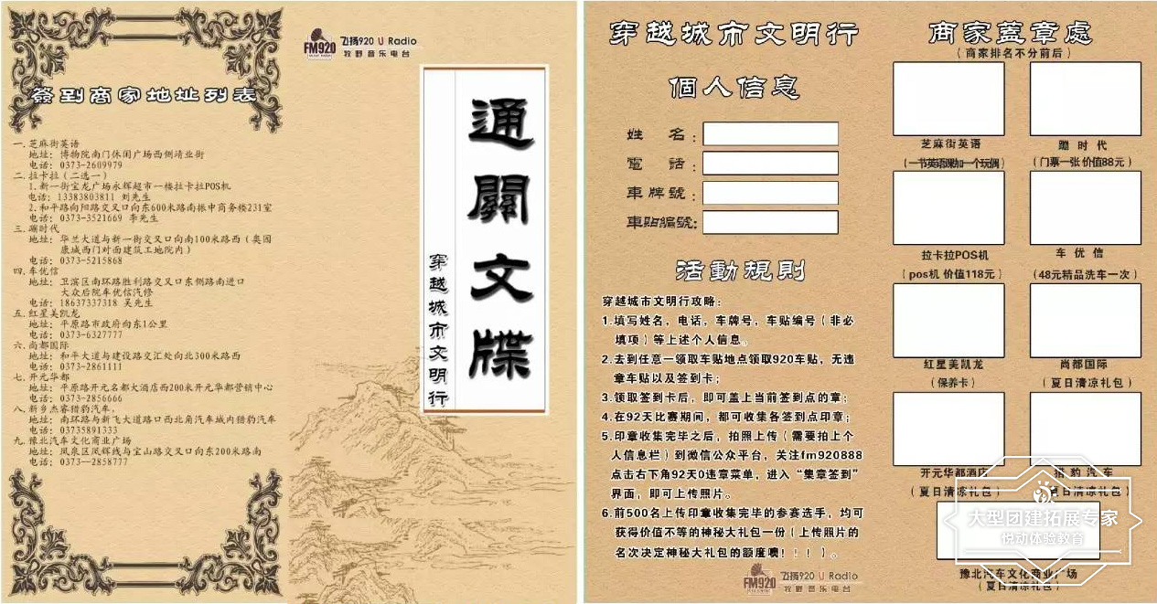 13:30-16:30【圣水傳奇團建之旅】 通關文牒 項目介紹: 講解規則,各組領取通關文牒任務書,隊長帶領隊員深入了解挑戰內容 及 活動目的,隊伍內部組建微信溝通群,實現通關挑戰中信息共享 和 無縫對接 最終各組通力合作贏取印章、獲取生命之水 |