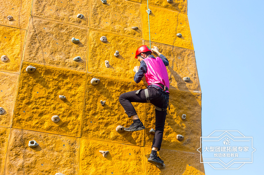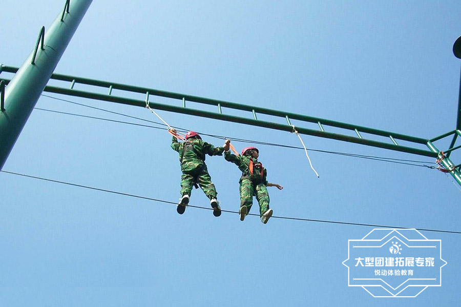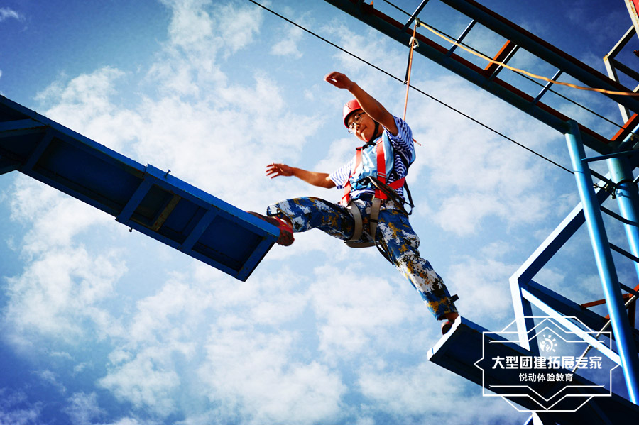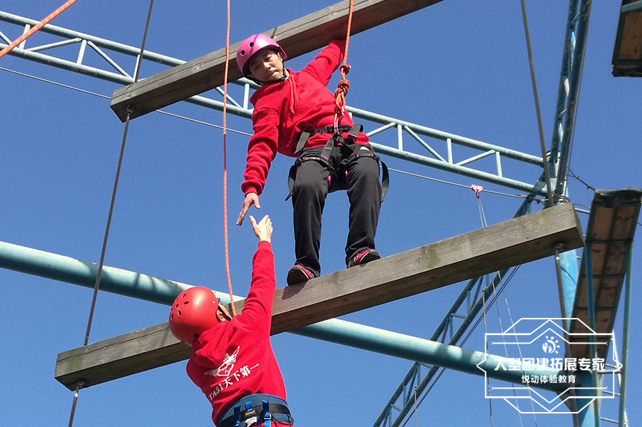 穿上跳傘一樣的全身式安全衣,固定好專業登山動力繩,兩人一起順著一根立柱,徒手爬山9.6米高度,4只手相互支撐,從鋼絲的一端走向越來越寬的另外一端,挑戰成功;專業教練將學員空降回地面。克服心里障礙,表面上似乎你做不到的事情,其實并不是你想象的那么困難;無論后退是多么舒適,也不為舒適而后退;無論前進是多么艱難,也要在艱難中前進。
