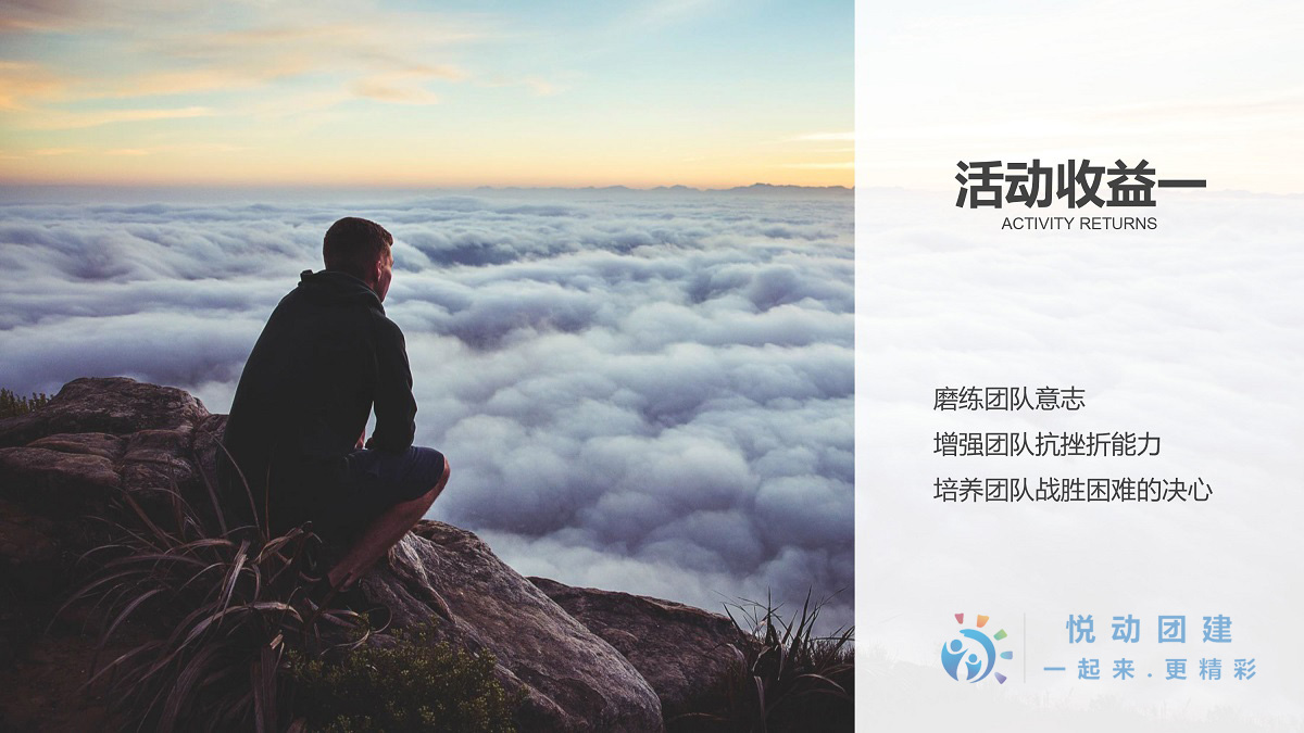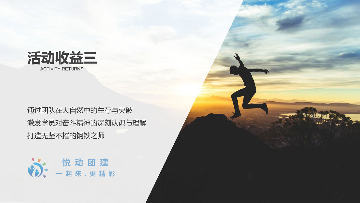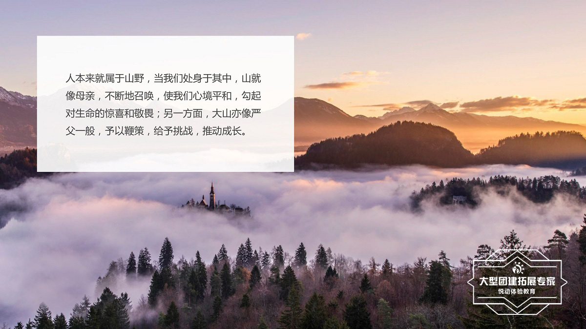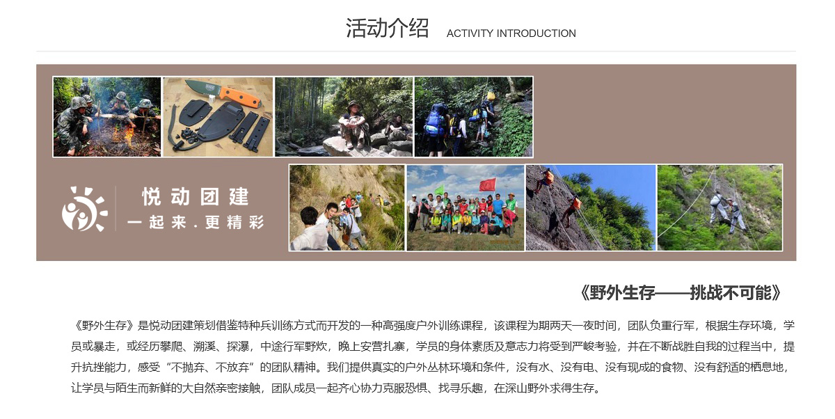 徒步 露營 野炊 負重前行 團隊任務。 野外生存訓練是悅動團建借鑒特種兵訓練方式, 而開發的一種高強度戶外訓練課程,該課程為期兩天 一夜, 團隊負重行軍,根據生存環境,學員或暴走, 或經歷攀爬、溯溪、探瀑,中途行軍野炊, 晚上 安營扎寨,學員的身體素質及意志力將受到嚴峻考驗, 并在不斷戰勝自我的過程當中, 提升抗挫能力, 感受“不拋棄,不放棄”的團隊精神。 我們提供真實的戶外叢林環境和條件, 沒有水、沒有電、沒有 現成的食物、沒有舒適的棲息地, 讓學員與陌生而新鮮的大自然親密接觸, 團隊成員一起齊心協力克服 恐懼、找尋樂趣,在深山野外求得生存。
