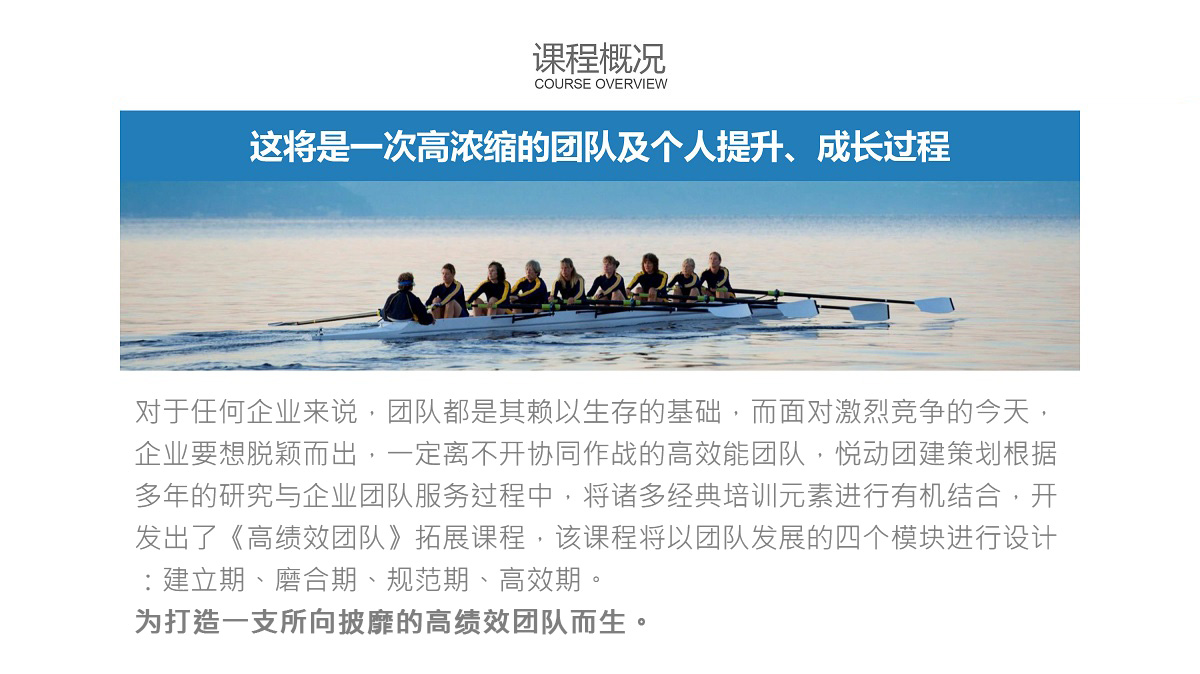對于任何企業來說,團隊都是其賴以生存的基礎,而面對激烈競爭的今天,企業要想脫穎而出,一定離不開協同作戰的高效能團隊,悅動團建策劃根據多年的研究與企業團隊服務過程中,將諸多經典培訓元素進行有機結合,開發出了《高績效團隊》拓展課程,該課程將以團隊發展的四個模塊進行設計:建立期、磨合期、規范期、高效期,為打造一支所向披靡的高績效團隊而生。