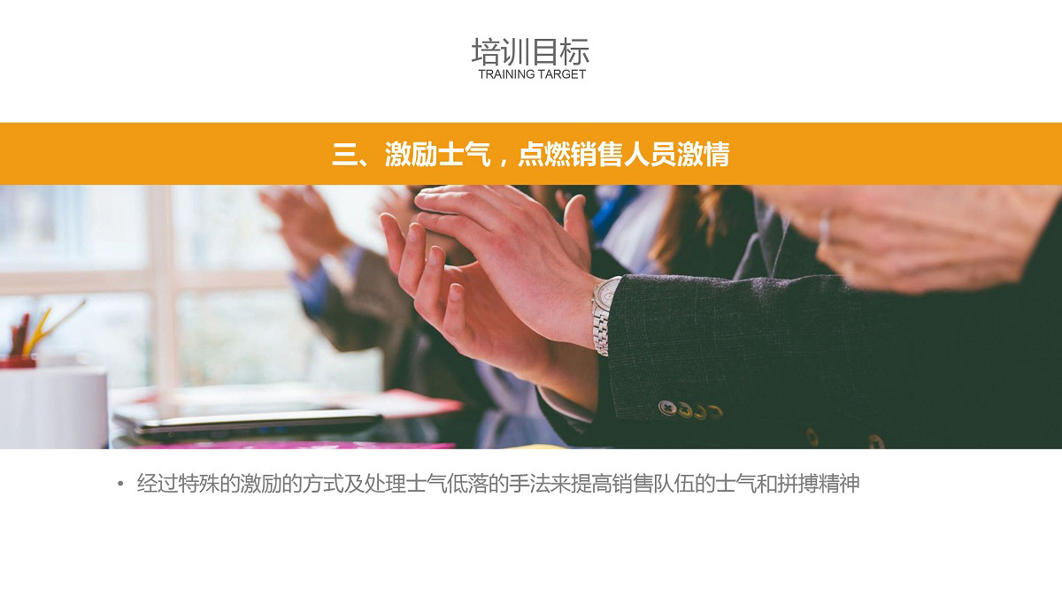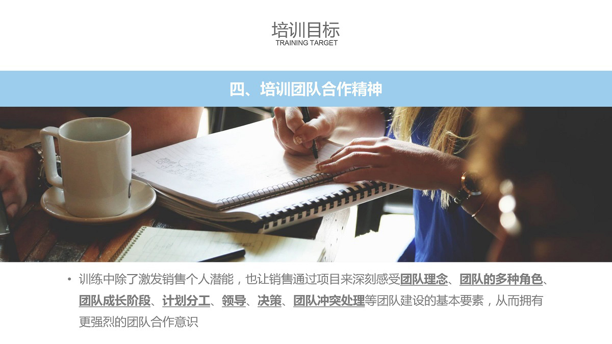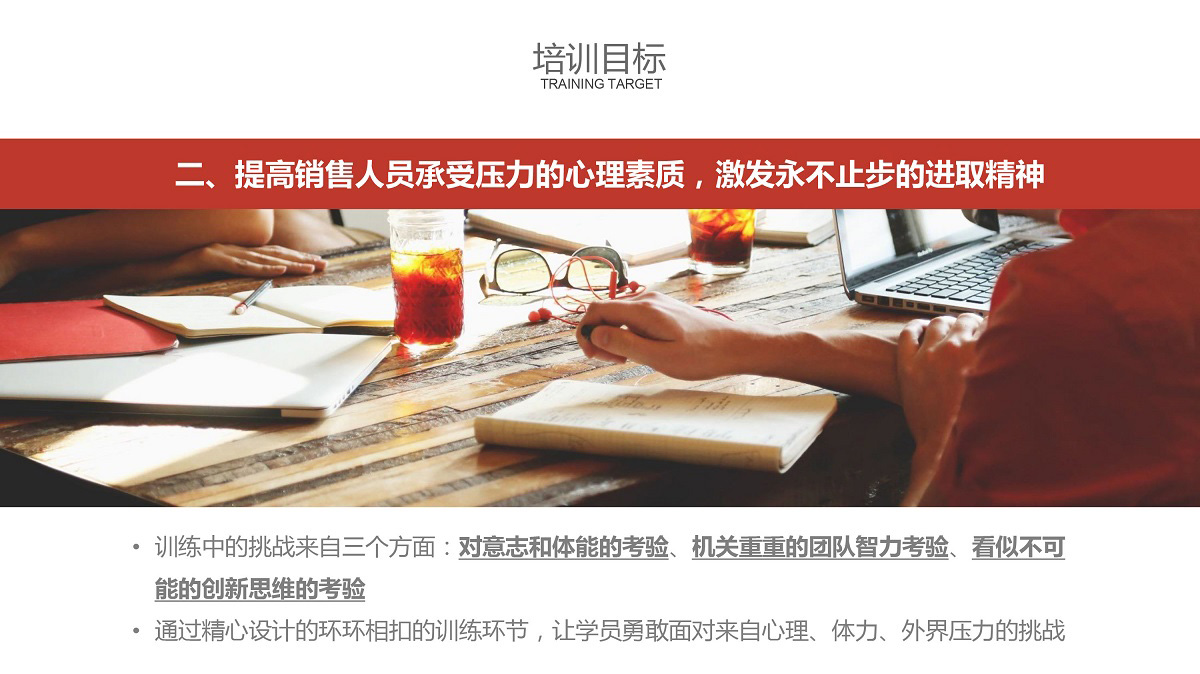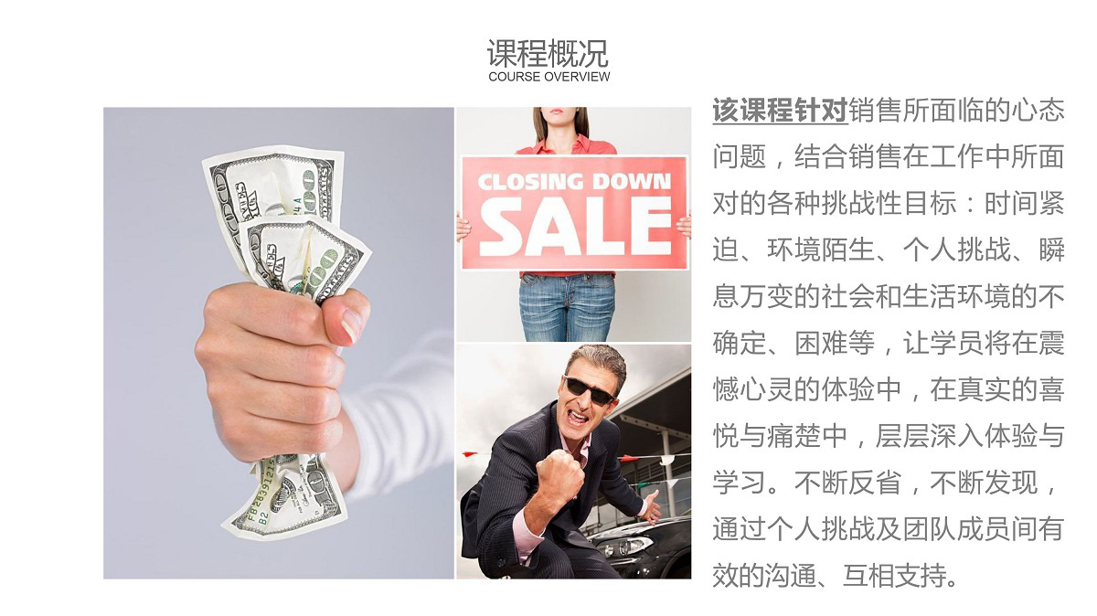 針對銷售人員的特點,我們貫穿課程的四大關鍵詞“團隊合作”、“挑戰與創新”、“馬上行動”和“激勵”,并以此為基礎為銷售團隊設計該課程。最大程度提升銷售團隊的戰斗力及業績表現。