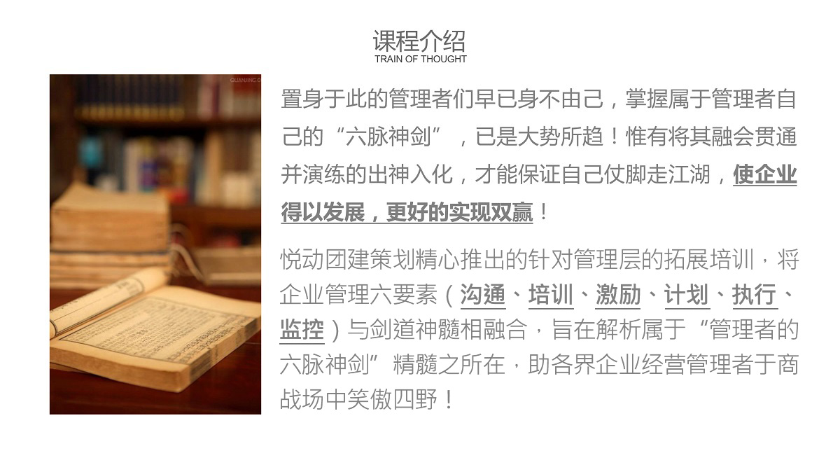 悅動(dòng)團(tuán)建策劃精心推出的針對(duì)管理層的拓展培訓(xùn),將企業(yè)管理六要素(溝通、培訓(xùn)、激勵(lì)、計(jì)劃、執(zhí)行、監(jiān)控)與劍道神髓相融合,旨在解析屬于“精英管理層訓(xùn)練營”精髓之所在,助各界企業(yè)經(jīng)營管理者于商戰(zhàn)場(chǎng)中笑傲四野!