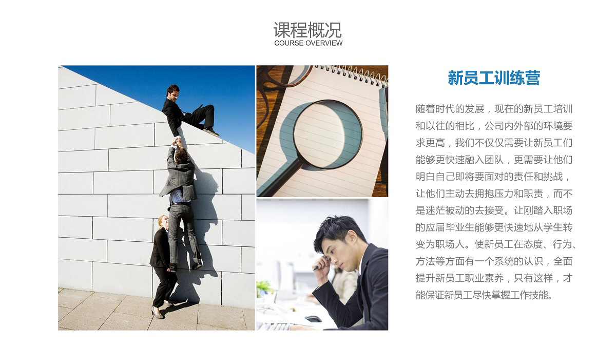 隨著時代的發展,現在的新員工培訓和以往的相比,公司內外部的環境要求更高,我們不僅僅需要讓新員工們能夠更快速融入團隊,更需要讓他們明白自己即將要面對的責任和挑戰,讓他們主動去擁抱壓力和職責,而不是迷茫被動的去接受。讓剛踏入職場的應屆畢業生能夠更快速地從學生轉變為職場人。使新員工在態度、行為、方法等方面有一個系統的認識,全面提升新員工職業素養,只有這樣,才能保證新員工盡快掌握工作技能。