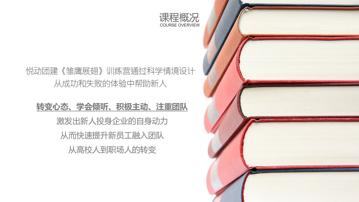 悅動團建《雛鷹展翅》訓練營通過科學情境設計,從成功和失敗的體驗中幫助新人轉變心態、學會傾聽、積極主動、注重團隊,激發出新人投身企業的自身動力,從而快速提升新員工融入團隊,從高校人到職場人的轉變。